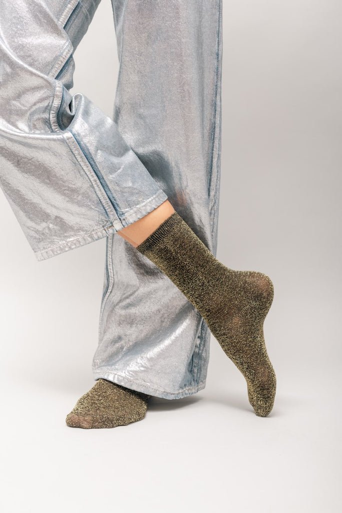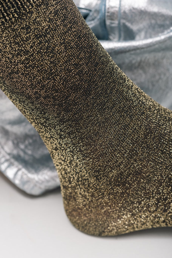 Medias brillantes doradas que llegan a media pantorrilla. Quedan bellas con flats, mocasines, zapatos de goma o tacones.