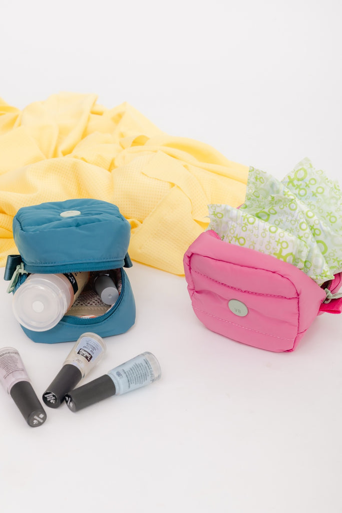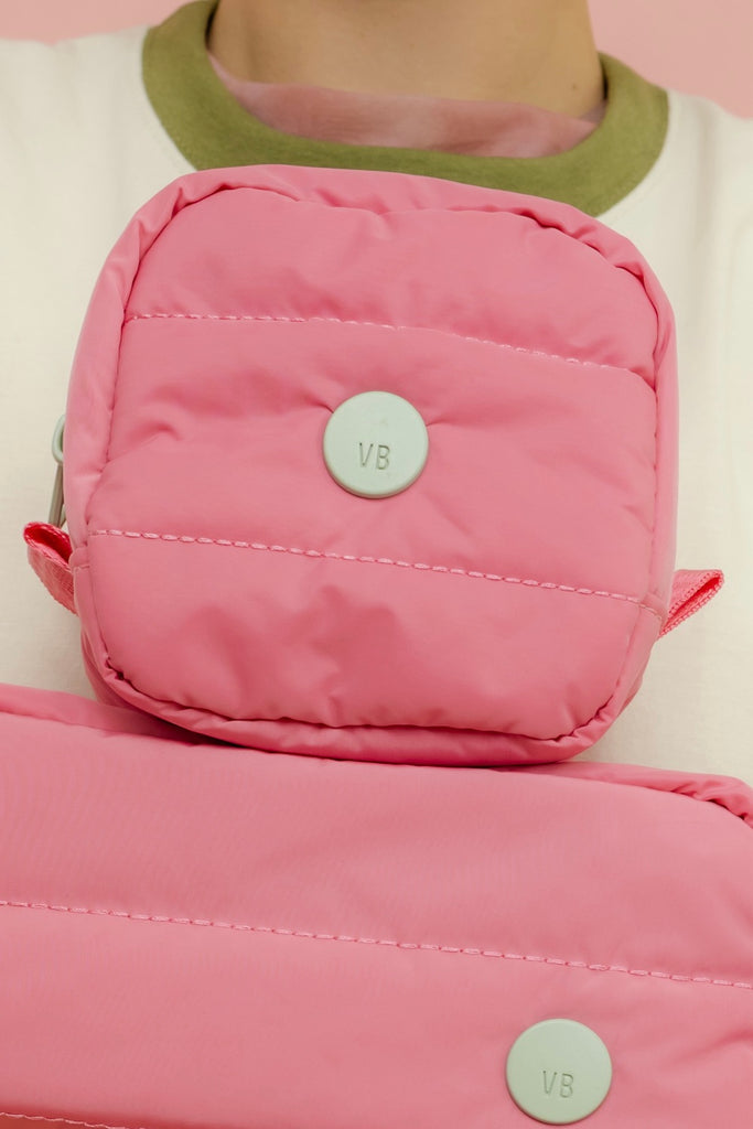 Estuchito cuadrado puffy de nylon en color rosado chiclebomba con bolsillito interno de malla. Medidas: 10cm x 10cm x 10cm