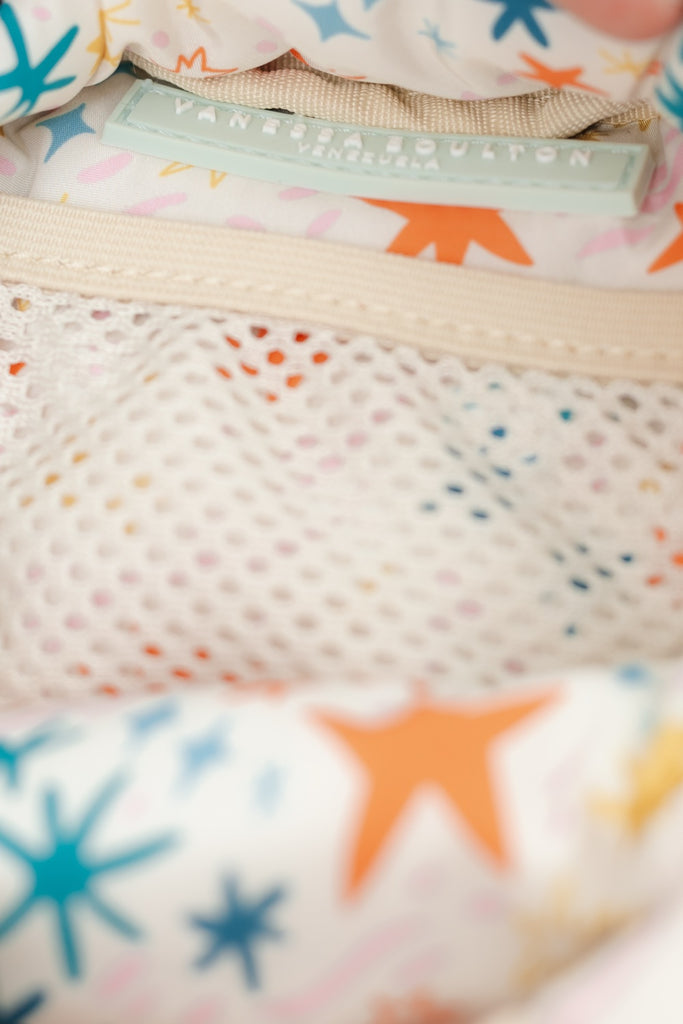 Estuchito cuadrado puffy de nylon en color marrón chocolate con bolsillito interno de malla. Medidas: 10cm x 10cm x 10cm