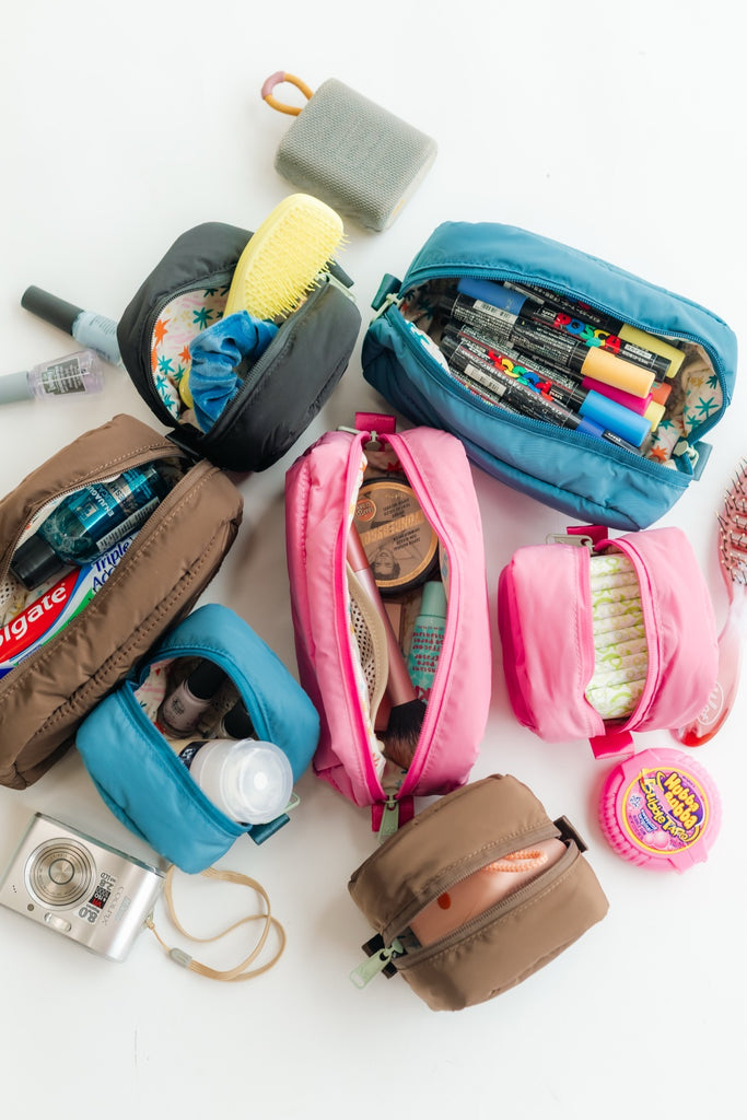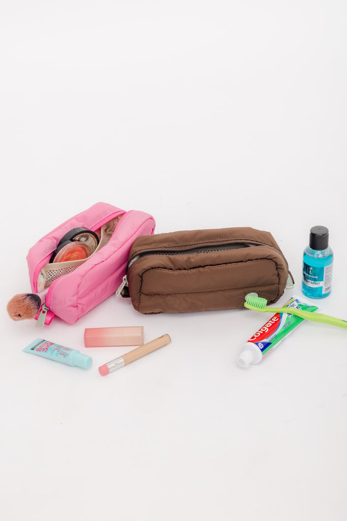 Estuche puffy rectangular en color rosado chiclebomba con bolsillito interno de malla. Medidas: 20cm x 10cm x 10cm