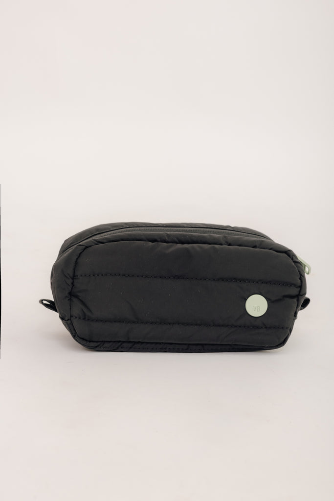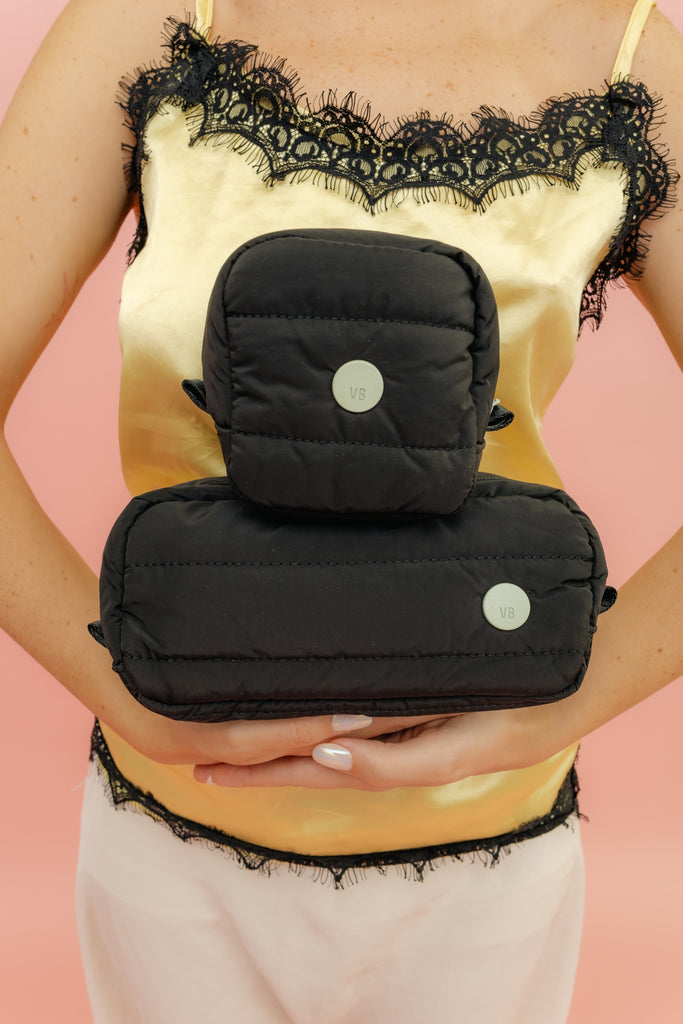 Estuche puffy rectangular en color negro con bolsillito interno de malla. Medidas: 20cm x 10cm x 10cm