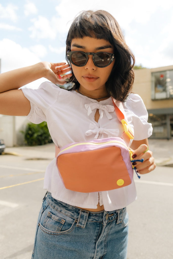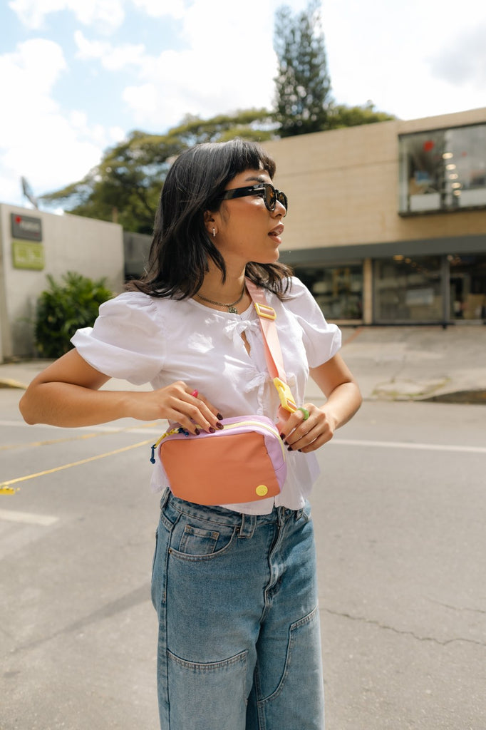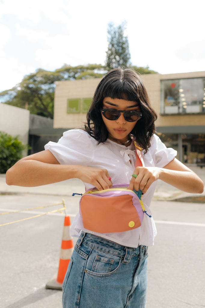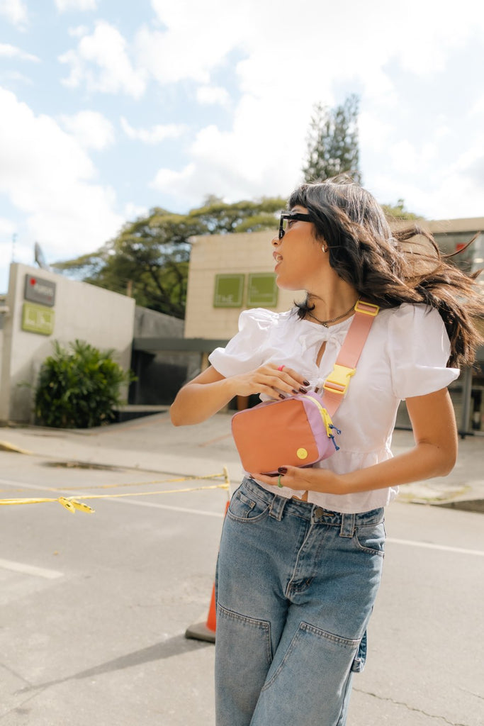 Koala de nylon con tira ajustable. Cierre superior y bolsillo trasero con cierre (para la caleta). Adentro tiene varios bolsillitos planos de malla para pequeños esenciales como audífonos y chicle.