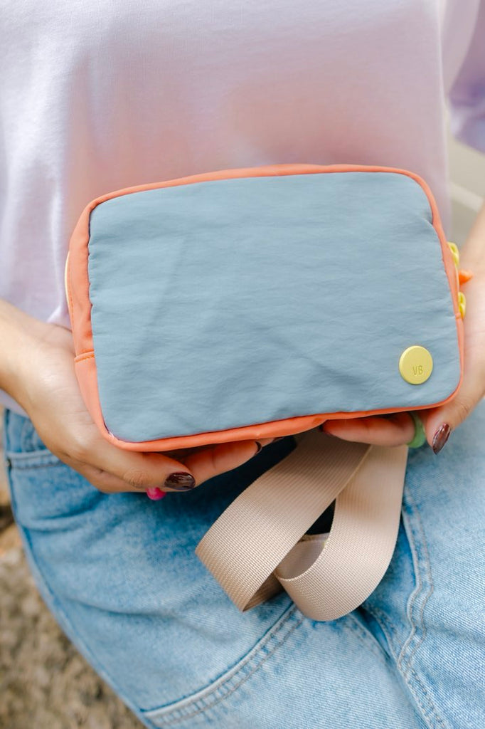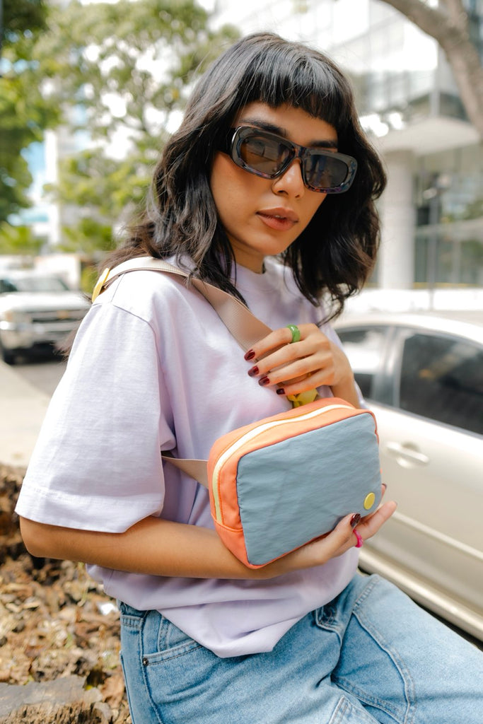 Koala de nylon con tira ajustable. Cierre superior y bolsillo trasero con cierre (para la caleta). Adentro tiene varios bolsillitos planos de malla para pequeños esenciales como audífonos y chicle.