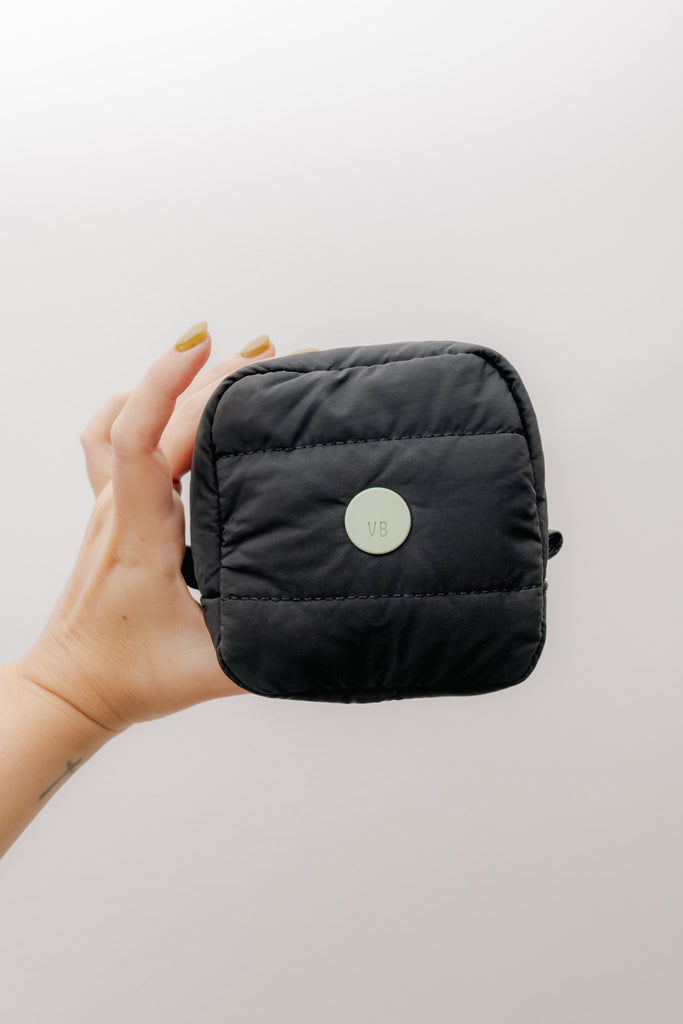 Estuchito cuadrado puffy de nylon en color negro con bolsillito interno de malla. Medidas: 10cm x 10cm x 10cm