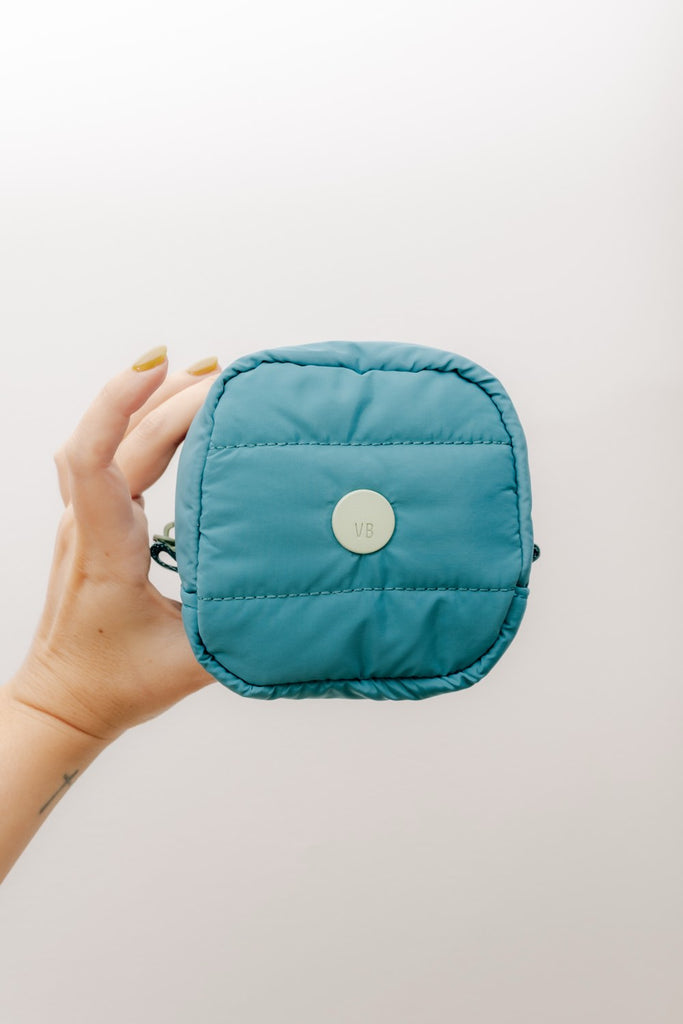 Estuchito cuadrado puffy de nylon en color verdemar (turquesa oscuro) con bolsillito interno de malla. Medidas: 10cm x 10cm x 10cm