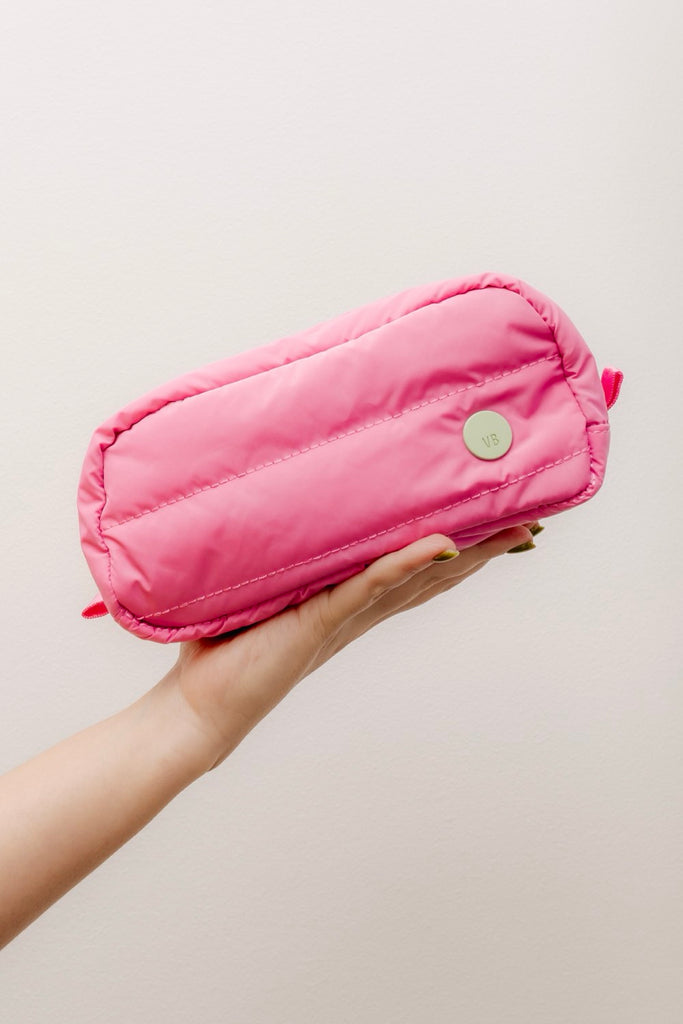 Estuche puffy rectangular en color rosado chiclebomba con bolsillito interno de malla. Medidas: 20cm x 10cm x 10cm
