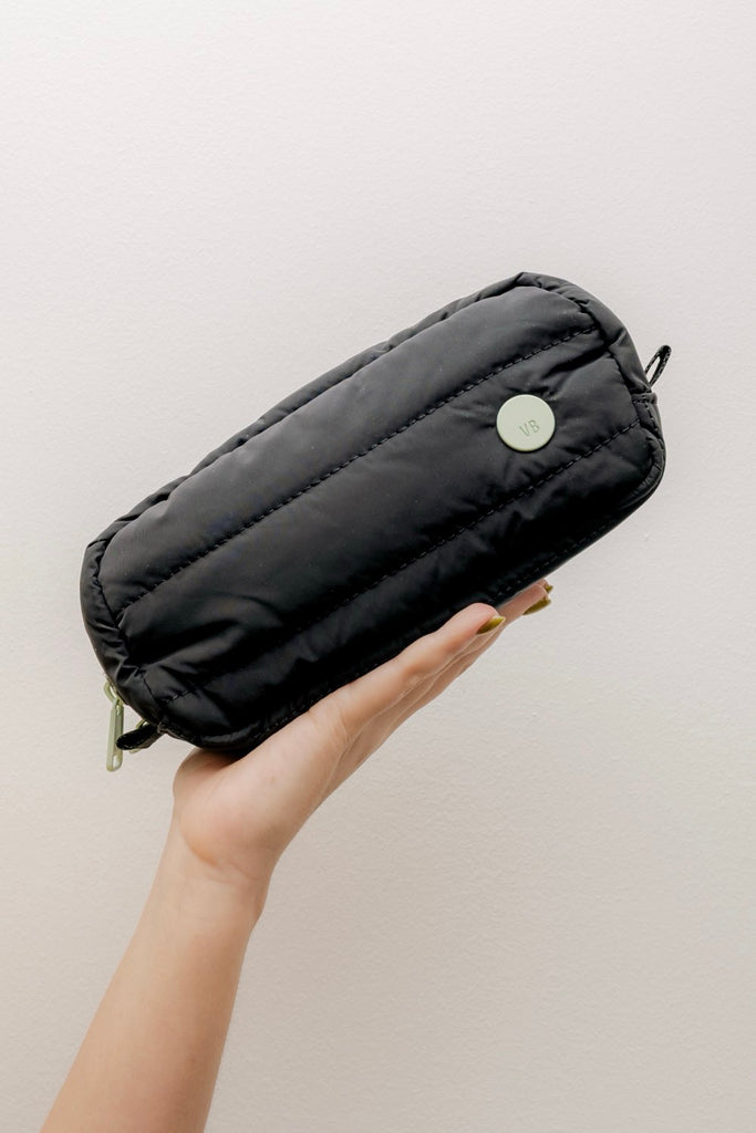 Estuche puffy rectangular en color negro con bolsillito interno de malla. Medidas: 20cm x 10cm x 10cm