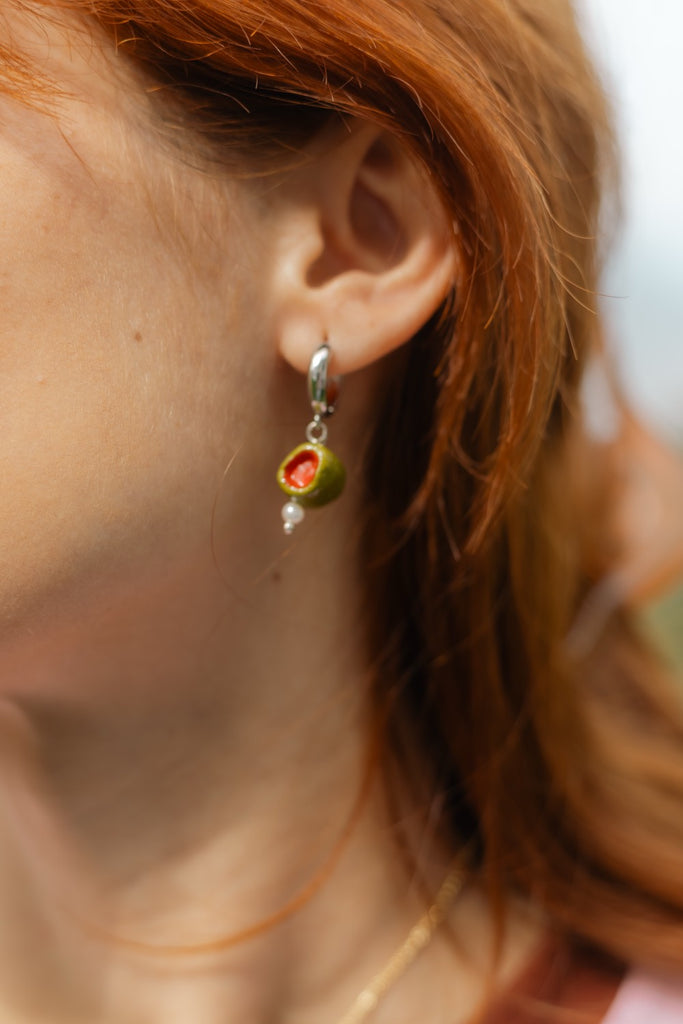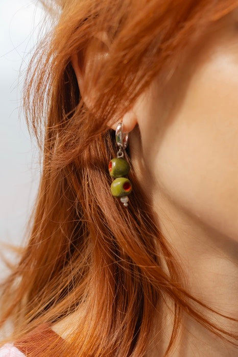 Zarcillos ACEITUNAS. Argollitas en baño de oro con una aceituna a un lado y dos al otro lado. Vienen en un cartoncito colorido, perfecto para regalar.